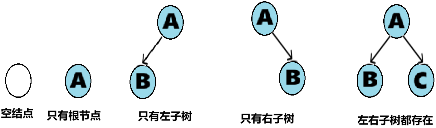 不管二叉树是什么样的结构形状,他们都是由下面这几种情况复合而成的: