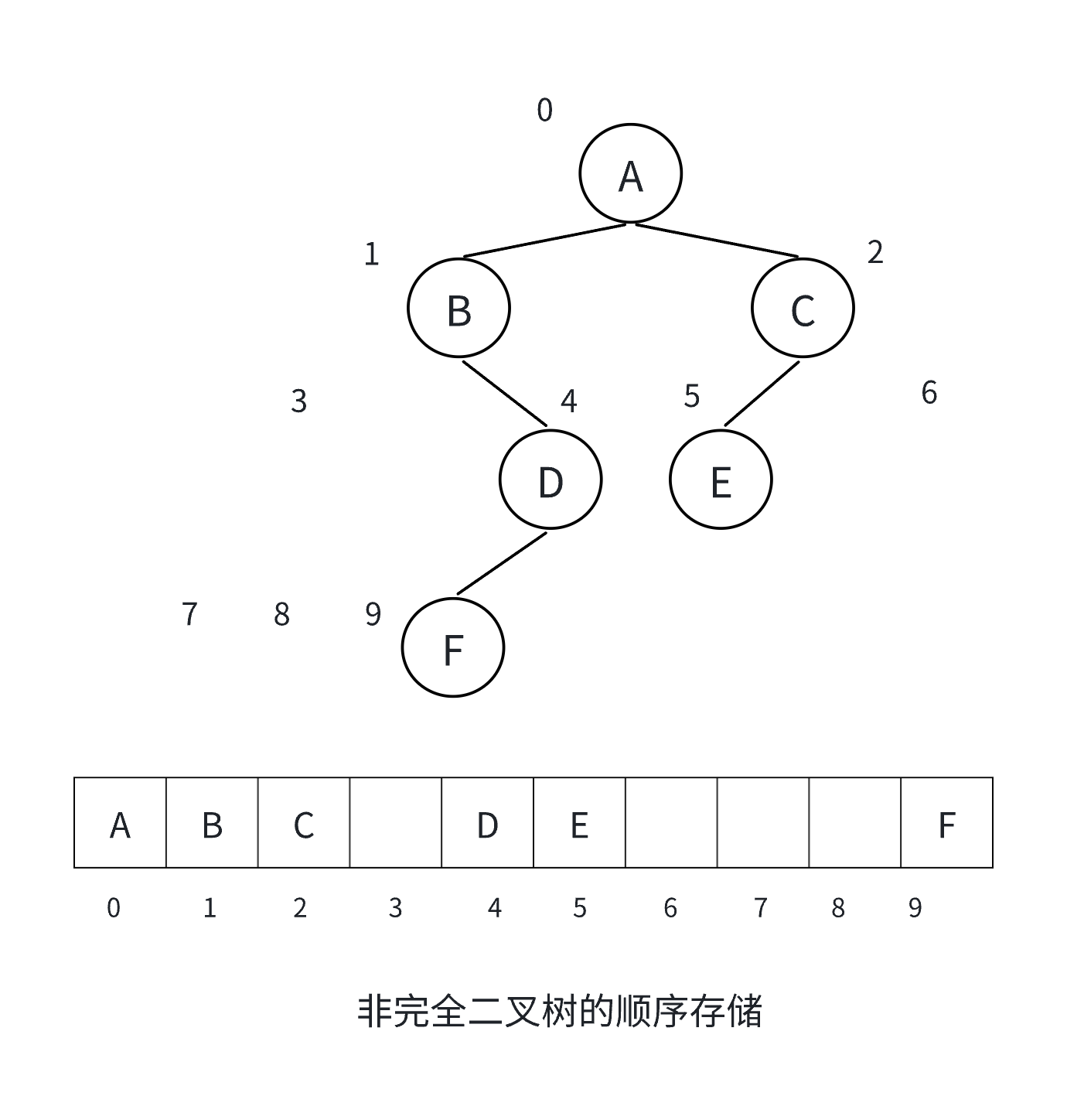 根节点毫无疑问就是在数组的第一个位置,随后是根节点的左子树,再到右子树,再到左子树的左节点右节点...以此类推,这样每个节点在数组中都有一一对应的位置,这是完全二叉树在数组中的存储结构,那如果不是完全二叉树呢?在数组中又该怎么表示呢?简单,如下图所示: