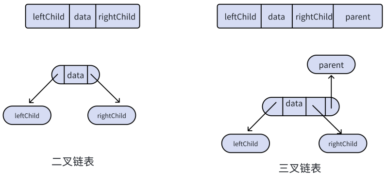 用链表表示二叉树通常的方法是每个链表节点中有三个作用域组成,分别是左右指针域和数据域,左右指针域存储的是该结点的左右孩子的地址,数据域是该节点存储的数据,这就是我们现在要学习的二叉链表。在二叉树的链式表示中,分为刚刚讲的二叉链表,还有三叉链表,这会在c++课程中详解讲解,大家敬请期待哈.三叉链表就是指针域有三个指针,除去指向左右孩子的指针外,还多出一个指向父结点的指针,这一般会在红黑树等高阶数据结构中会使用到,下面是这两种链表的结构图: