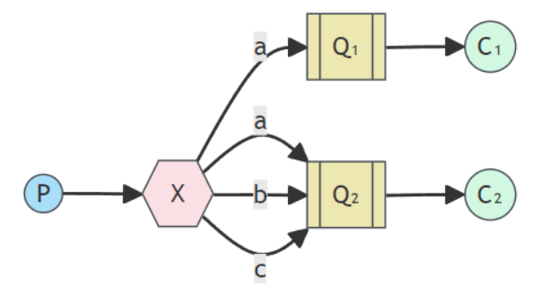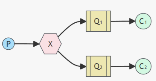 一个生产者P,多个消费者C1、C2,此外 X 代表交换机,它可以将消息复制多份,让多个消费者接收相同的消息。