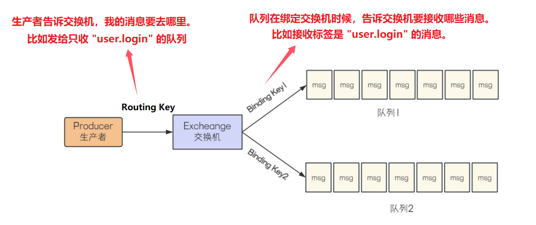 routing key 的队列(Routing 路由模式)routing pattern 的队列(Topics 通配符模式)headers 属性进行匹配。(headers 类型的交换器性能会很差,而且也不实用,基本上不会看到它的存在)Routing Key:路由键。生产者将消息发给交换器时,指定的一个字符串,告诉交换机应该如何处理这个消息(即告诉交换机将该消息发送到哪里去)