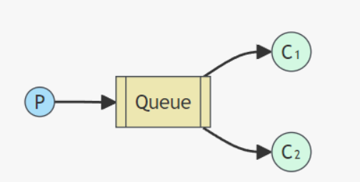 一个生产者P,多个消费者C1、C2。在多个消息的情况下,Work Queue会将消息分派给不同的消费者,每个消费者都会接收到不同的消息。RabbitMQ 默认使用 轮询(Round-Robin)分发给消费者。