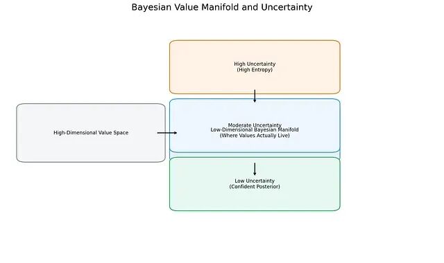 图 2. 虽然Transformer的值向量定义在高维空间,但训练使它们集中到低维贝叶斯流形上。沿流形移动对应不确定性的递减:随着各层整合更多证据,表征从高熵状态平滑过渡到低熵后验信念。