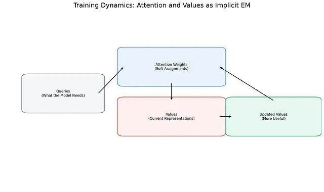 图 3. 训练过程中注意力与值表征形成正反馈回路。注意力权重为值分配软性重要性,值则通过梯度下降更新以更好服务于关注它们的查询。这种动态酷似隐式EM过程:注意力扮演软分配角色,值充当自适应原型。