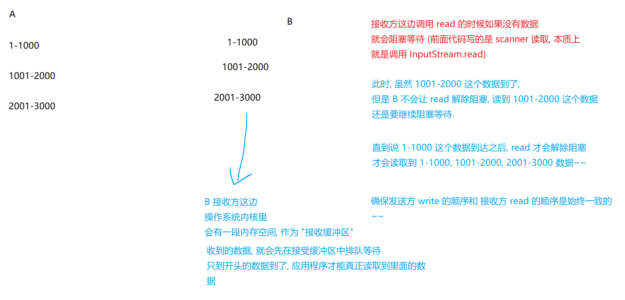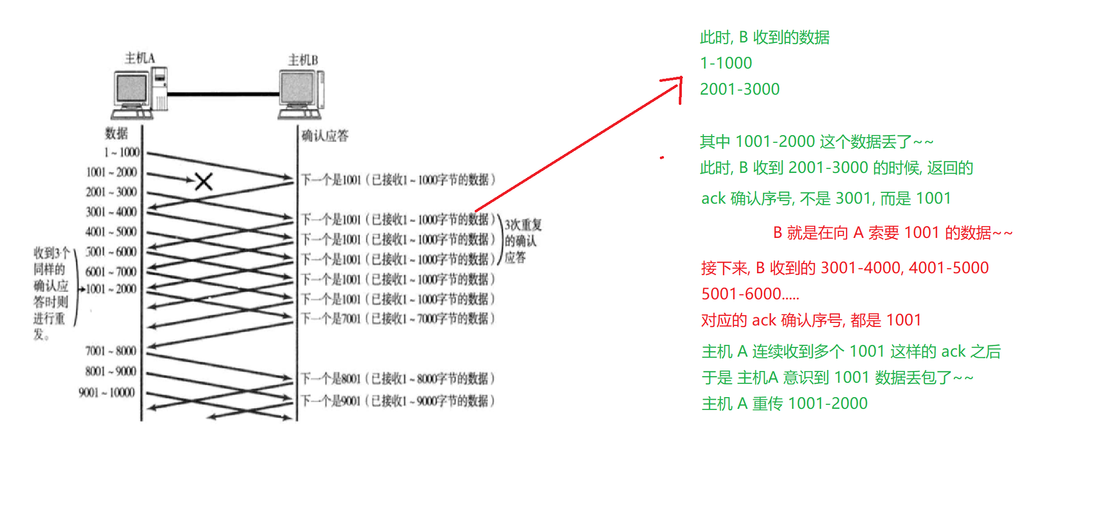 当1001-2000重传过来了之后,由于之前2001-7000数据都是已经发过的 1001-2000相当于补全了之前的空缺,此时就意味着1-7000的数据都齐了 于是接下来索要7001开头的数据即可 快速的识别出是哪个数据丢包,并且针对性的重传,其他顺利到达的数据都无需重传, 这个过程称为“快速重传” 如果通信双方,单位时间发送的数据量比较少,就是按照之前的确认应答/超时重传 如果单位时间发送的数据比较多,就会按照滑动窗口/快速重传