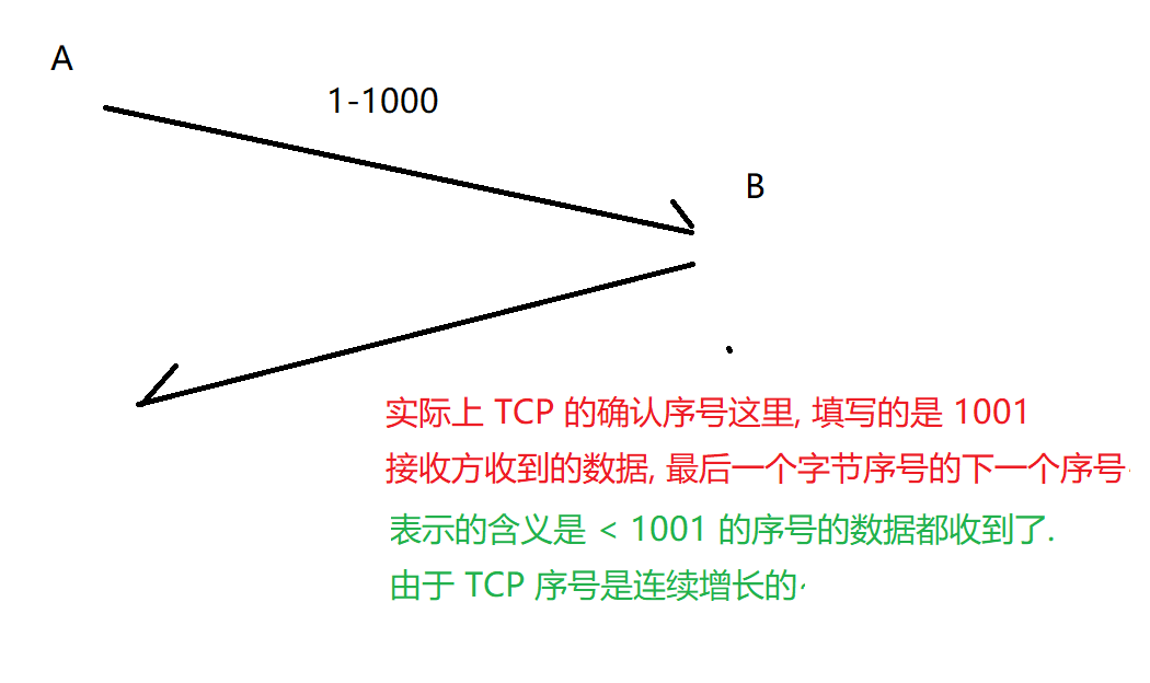 丢失ACK只是丢失一部分,不可能全丢 理解,确认序号的含义 表示的是收到的数据最后一个字节的,下一个序号 进一步理解成,确认序号之前的数据,都已经收到了 接下来你要发的数据就从确认序号这里往后发 虽然1001ack丢了.但是2001到达,发送方收到2001之后,意味着2001之前的数据都已经收到了. 后一个ACK能够涵盖前一个ACK的意义