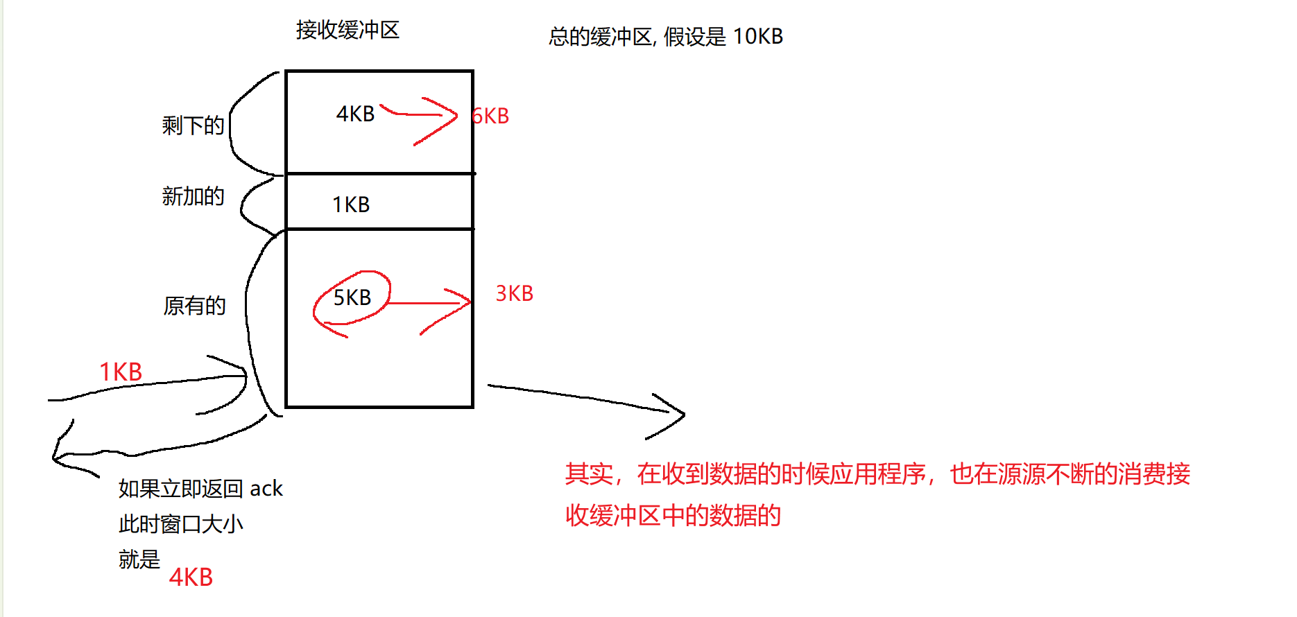 假设让ack100ms之后再返回,这就意味着此时在100ms内应用程序可能又消费掉2KB的数据了,此时返回的ack携带的窗口大小就是6KB 延时返回的ack的窗口大小,大概率就要比立即返回ack的窗口大小更大,在这个时间里,会有一个消费数据的过程(大概率,取决于应用程序的代码怎么写,是否是不停的读取数据;延时时间内是否发送方会发新的数据过来)