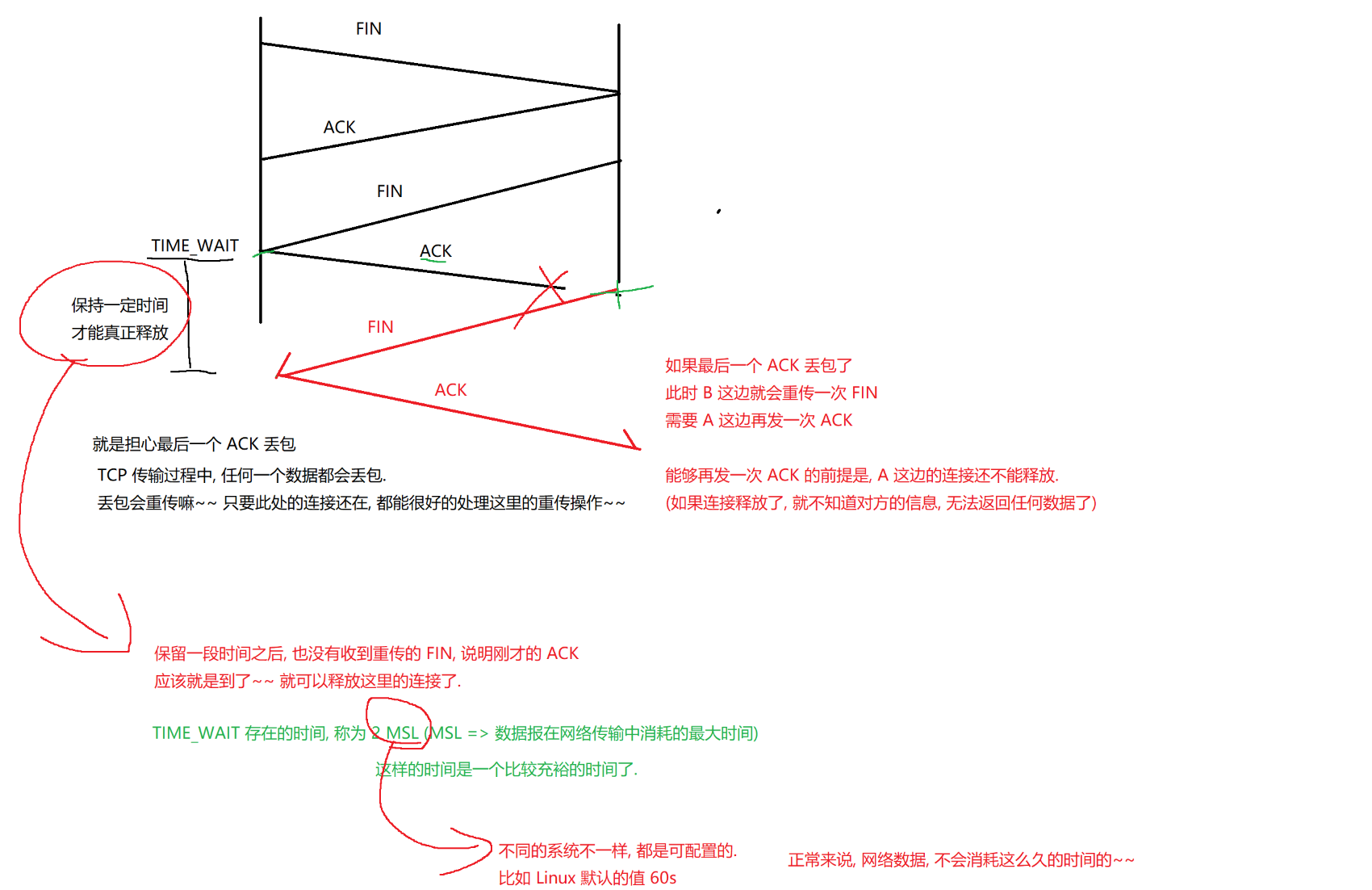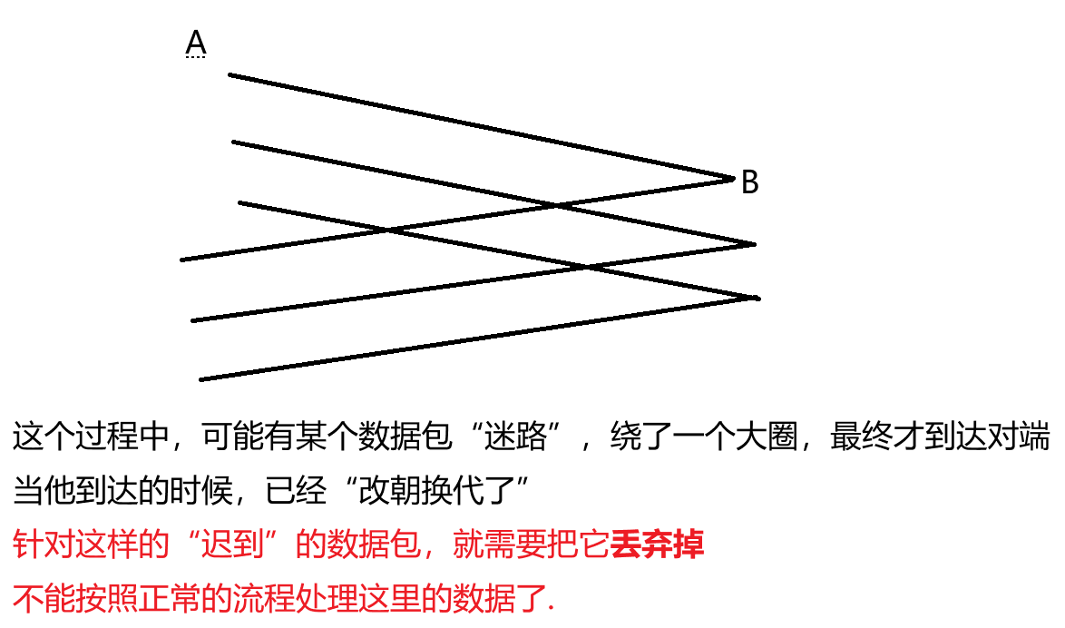 过了一会,A和B又重新建立连接虽然还是AB两个主机的连接,但是可能是不同的应用程序 对于B来说,就需要区分,当前收到的数据是"本朝”还是"前朝”的 给每个连接,都协商不同的起始的序号 如果发现收到的数据,和起始序号以及和最近收到的数据序号,都差别很大的话,就视为这个数据就是前朝”的数据 注:三次握手对于可靠性是有一定的支持的,但可靠性就是三次握手体现的这句话就非常武断,三次握手是在建立连接时进行的,建好连接后数据就开始传输了,此时和三次握手就没关系了 确认应答+超时重传才是负责传输数据过程中的"可靠性"