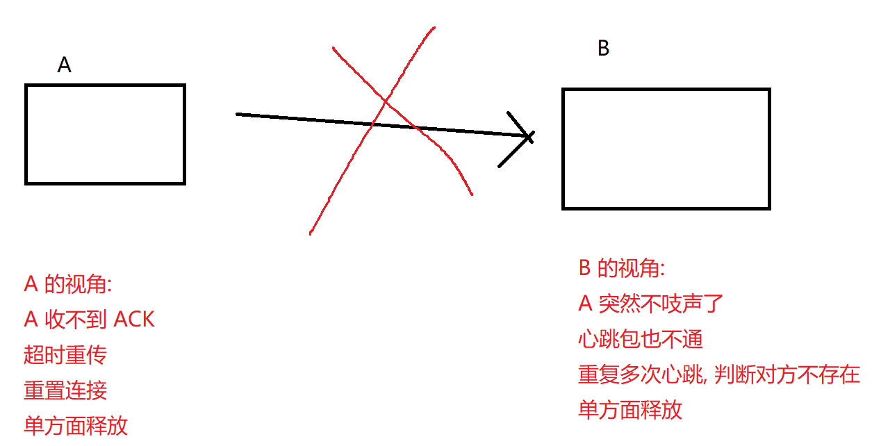 b)发送方掉电 A发送数据时突然中断,从B的角度无法判断A是彻底断线还是暂时休息、稍后会恢复。这时B会向A发送一个探测数据包(不含业务数据,仅用于触发ACK),以确认A的状态。如果A回复了ACK,说明A只是短暂停顿并未断线;如果A没有回应任何ACK,则可以判定A已经断开连接。 这样的探测报文是周期性的,同时这个报文是用来探测对方生死的,也就把这样的报文称为"心跳包"