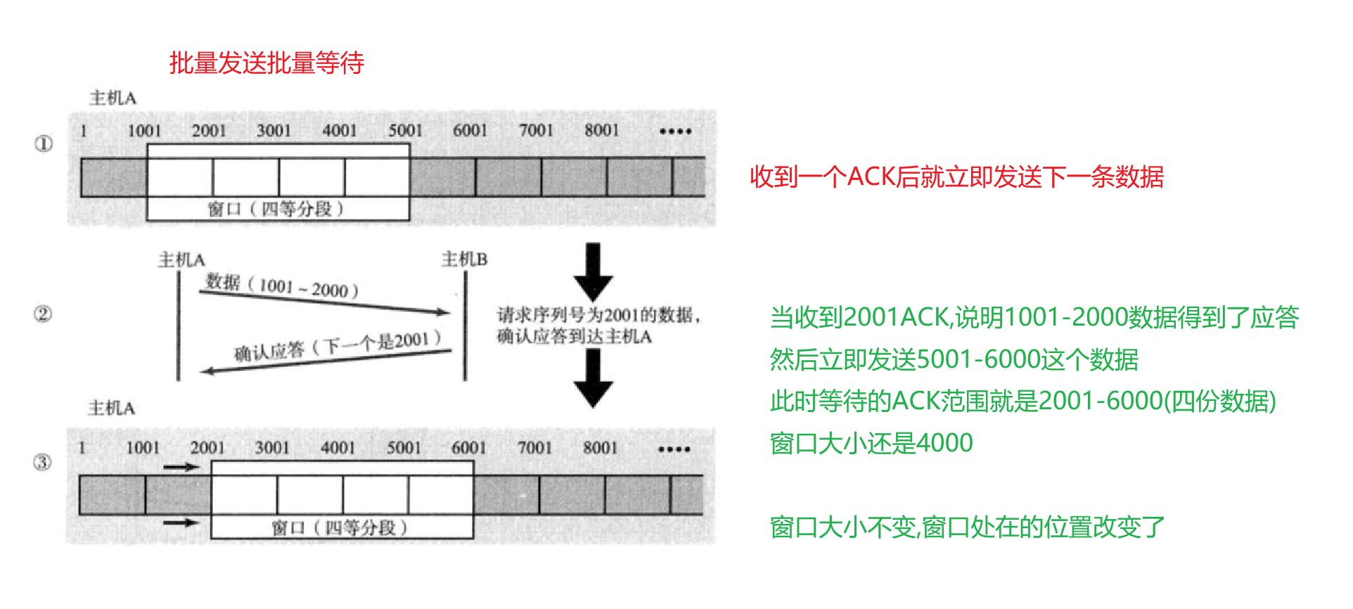 窗口大小指的是无需等待确认应答而可以继续发送数据的最大值,上图的窗口大小就是4000个字节(四个段).