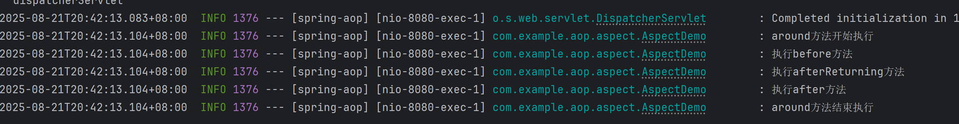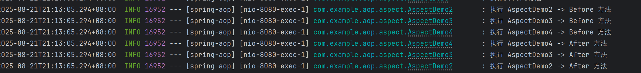 log.info("执⾏ AspectDemo2 -> Before ⽅法");