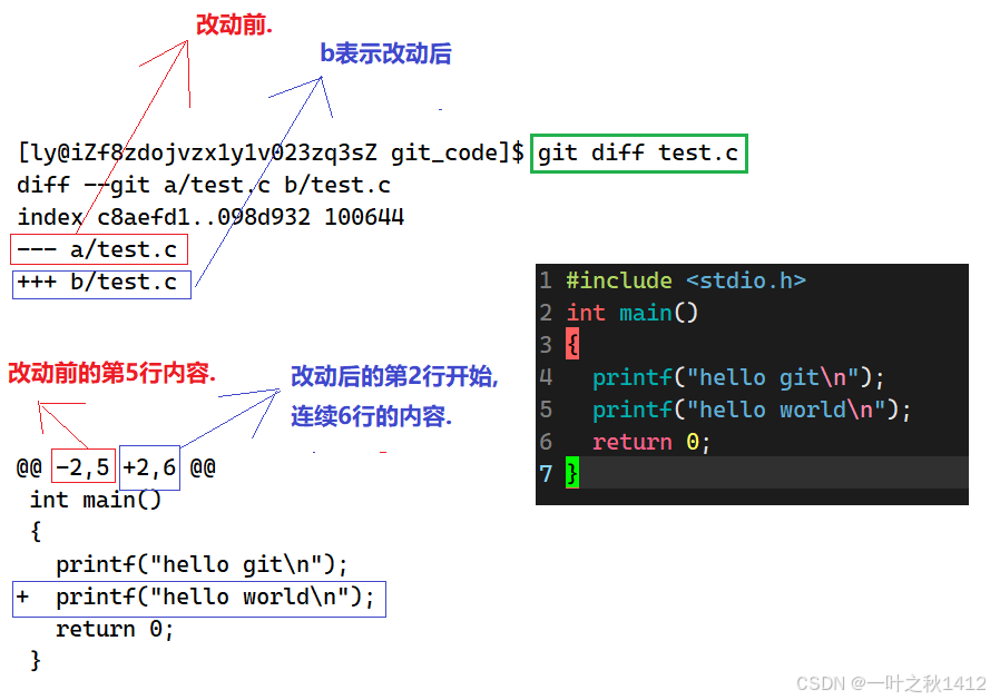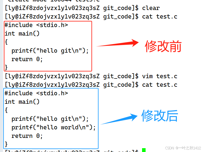 这就是我们对test.c文件进行的修改,被git记录了下来.
