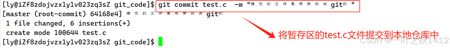 git commit命令执行成功后会告诉我们,1个文件被改动(就是我们添加了test.c文件),插入了6行内容(test.c文件有6行内容).