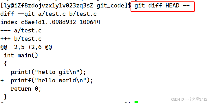 目前,我们只是知道test.c文件被修改过了,但是,如果我们能知道哪些地方被修改了,就更好了,那么我们可以通过git diff 命令来查看文件的哪些地方被修改了~