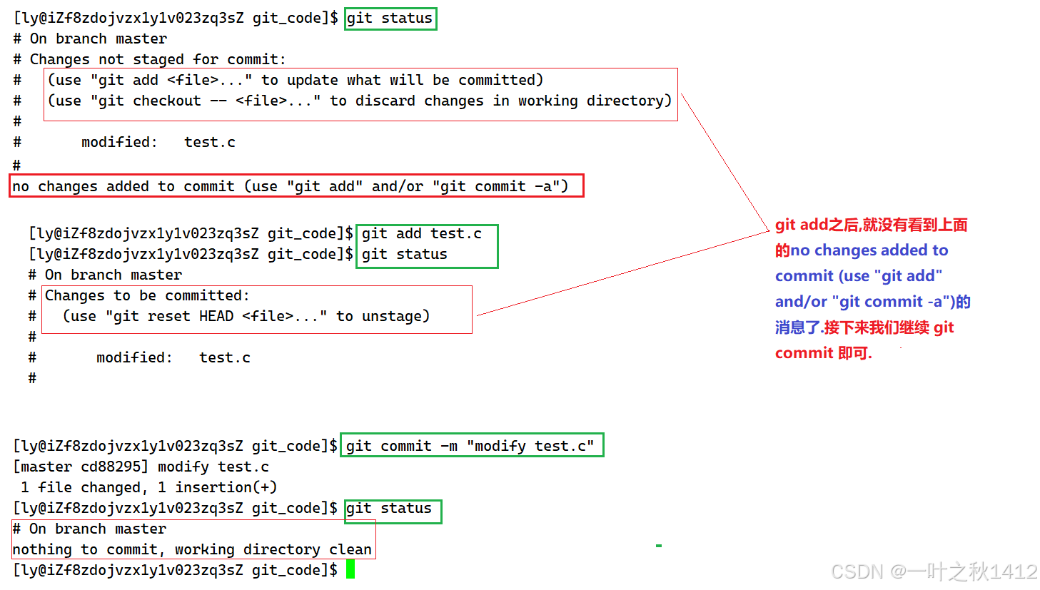 上面的结果告诉我们,test.c文件被修改过了,但是还没有完成添加与提交.