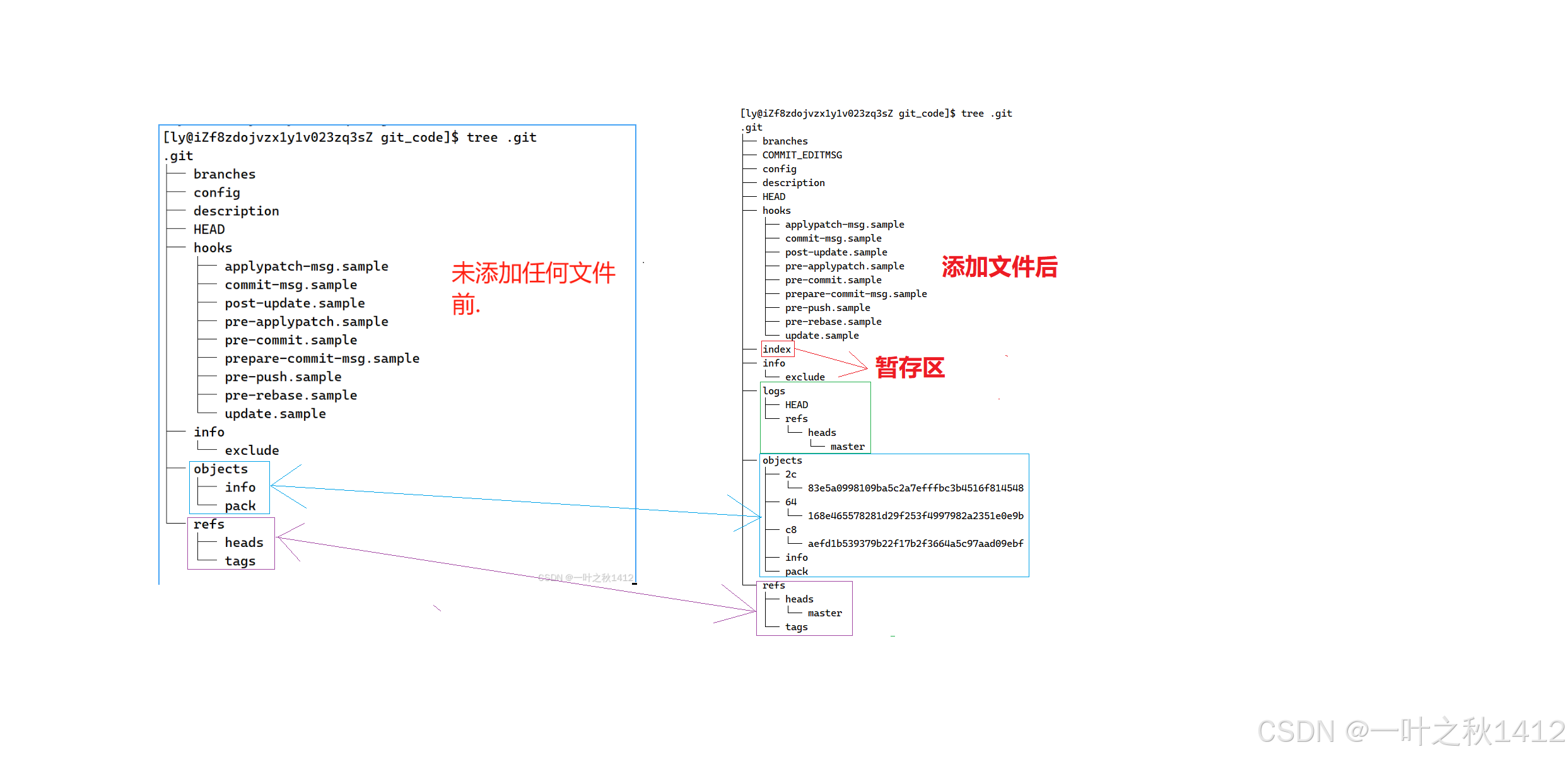 objects为Git的对象库,里面包含创建的各种版本库对象以及内容.当执行git add命令时,暂存区的目录树被更新,同时工作区修改(或新增)的文件内容被写入到对象库中的一个新的对象中,就处在".git/objects"目录下,我们可以来看看这些对象有什么用处.