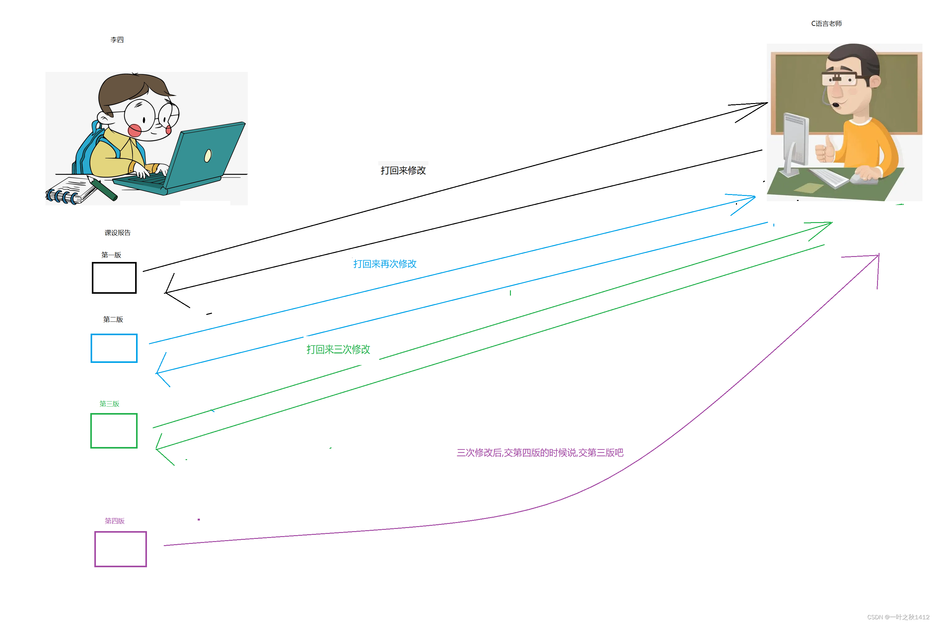 我们学计算机的小伙伴们,在学校里头都有实验课,那么老师呢就会要求我们写实验报告并且要求我们交上去给老师检查.有一个学计算机的大学生,名字叫张三,然后临近期末了,C语言老师要求学生们做一个课程设计并且写一份课程设计报告出来,这时候张三选择了做一个图书管理系统,然后呢张三用了一周的时间完成了课程设计然后把课程设计报告交给了老师,老师一看,说:张三啊,你这个课程设计完成得还是不错的,但是这个报告呢,写得比较粗糙,你下去再修改下,这个时候张三就听老师的话,下去修改了下,然后过了几天,张三又来找老师了,老师一看,就说:张三啊,你这个比上份那回报告写的好很多了,就是在某个板块上写得怎么说呢,不是很通俗易懂,你下去啊再改改吧,张三听了老师的话,然后下去又改了改,然后过了几天,张三又来找老师,老师一看,就说:张三啊,你这个报告怎么比上回改的还要差了呢而且格式也不对,你下去再改改吧,张三听了老师的话,下去接着改,然后过了几天,张三又去找了老师,老师一看,就说:张三啊,我看你这孩子挺努力的,我也不想再刁难你了,这样吧,你把改的第二版的实验报告给我吧,张三这时候听到这就很懵了,我第二版改的是啥来着,完全不记得了,然后张三就回到了宿舍跟舍友说下了这个事,同宿舍的舍友李四一听这个事就长了个心眼,为了防止之后交实验报告出现跟张三一样的情况,就想着,想着老师也要求自己频繁性地改课设报告的话,那我得提前做好准备,然后李四呢也去交了课设报告,果然,李四也发生了同样的情况,也被老师要求改实验报告,但是李四呢,每次在改实验报告前,都会把实验报告先复制一份留存,然后再去改,就这样子,李四连续被老师要求改了四次,到了第四次交实验报告的时候,老师说:李四啊,我看你这孩子挺聪明的,情商也挺高的,我也不是很想刁难你,这样子吧,你把你第三版的课设报告给我吧,然后李四回到宿舍呢,就直接找到了第三版的实验报告,接着交给了老师.故事到这就结束啦!