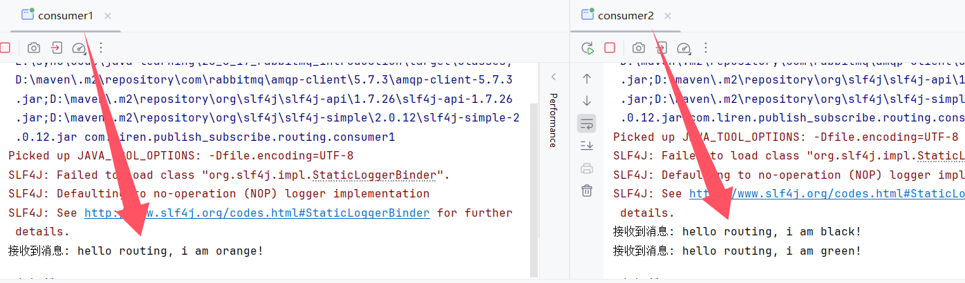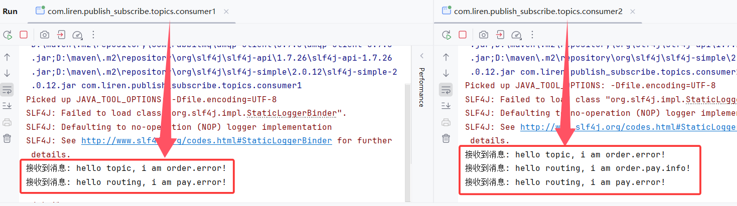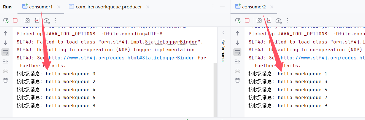 }消费者代码和简单模式一样,只是复制两份,两个消费者代码可以是一样的: