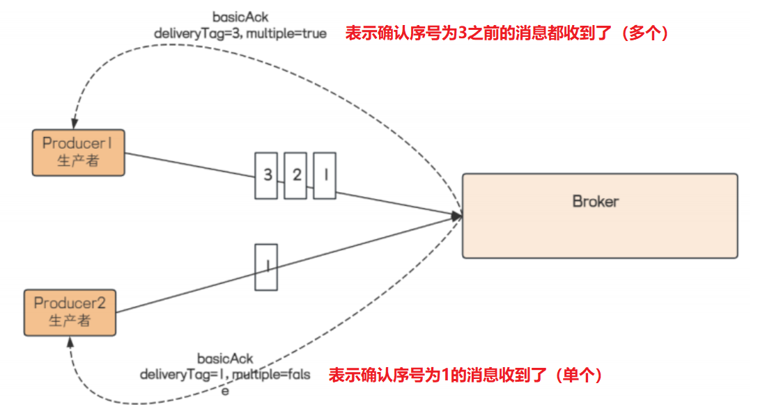 Broker 回传给生产者的确认消息中 deliveryTag 包含了确认消息的序号,此外 Broker 也可以设置 channel.basicAck 方法中的 multiple 参数,表示到这个序号之前的所有消息都已经得到了处理。