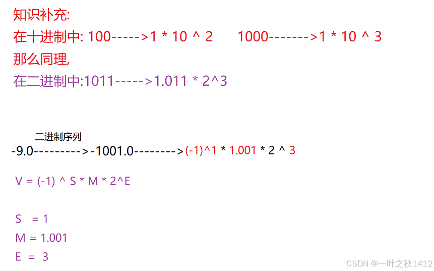 9 补码:000000000000000000000000000001001 从浮点数存储的角度出发 0(S) 00000000(E) 000000000000000000001001(M) 由于E为全0,那么此时E的真实值是1 - 127(32位) = -126 M = 0.000000000000000000001001 S = 0 因此V = (-1)^0 * 0.000000000000000000001001 * 2^-126-------->无线接近于0 9.0 二进制序列:1001.0 V = (-1)^0 * 1.001 * 2^3; S = 0, M = 1.001 , E = 3; 将其还原为二进制序列时,