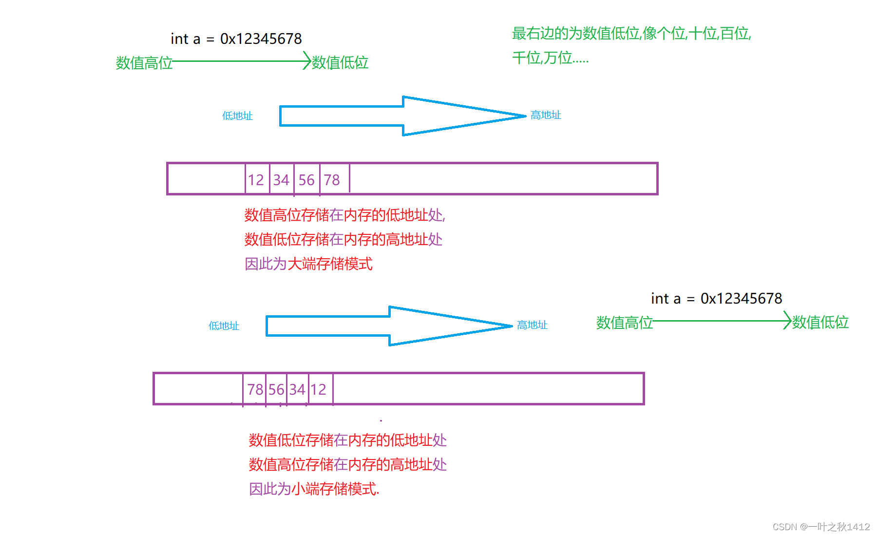 超过⼀个字节的数据在内存中存储的时候,就有存储顺序的问题,按照不同的存储顺序,将其分为 ⼤端字节序存储和⼩端字节序存储 .