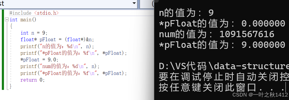 常见的浮点数:3.14159、1E10等,浮点数家族包括:float、double、long double 类型.那么浮点数在内存中是如何存储的呢,我们首先来看下面这段代码.