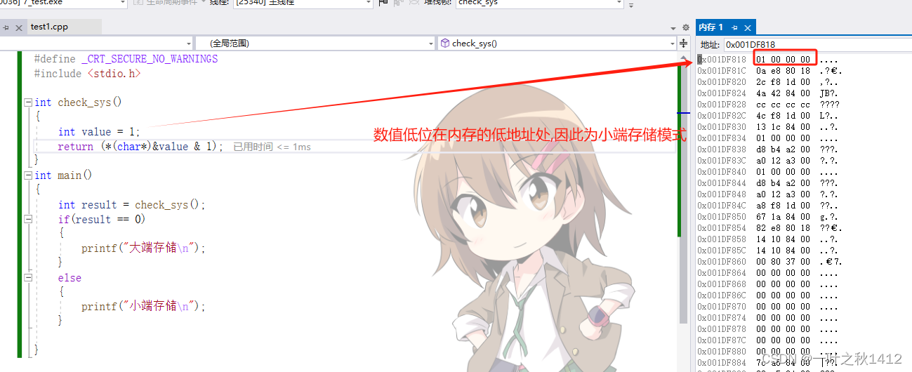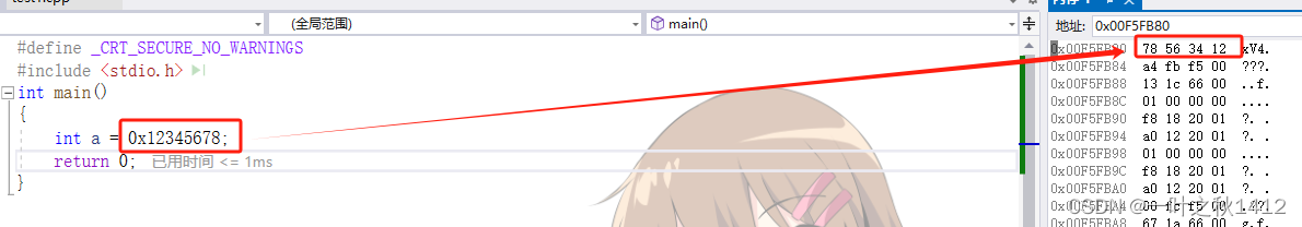通过调试,我们能够清晰地看到,在a中的 0x12345678 这个数字是按照字节为单位,倒着存储的。这是为什么呢?这里就要涉及到大小端存储啦