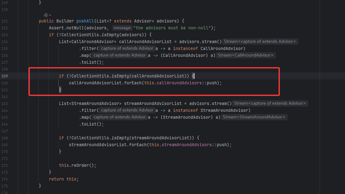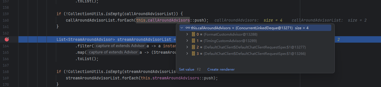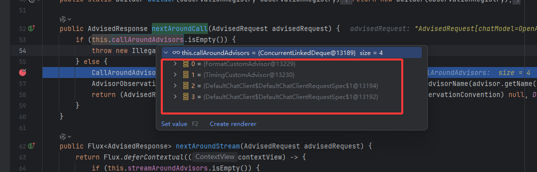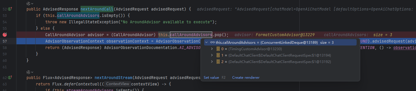 }为了验证这个猜想,我们在org.springframework.ai.chat.client.advisor.DefaultAroundAdvisorChain#nextAroundCall方法处,设置个断点。然后运行我们上面的例子看下:
