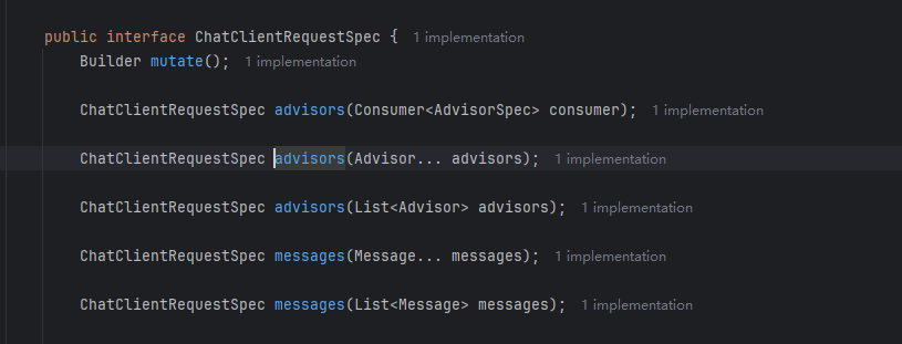 他是一个接口方法,那么找一下他的默认实现,就会跳到org.springframework.ai.chat.client.DefaultChatClient.DefaultChatClientRequestSpec#advisors(org.springframework.ai.chat.client.advisor.api.Advisor...)方法。可以看到: