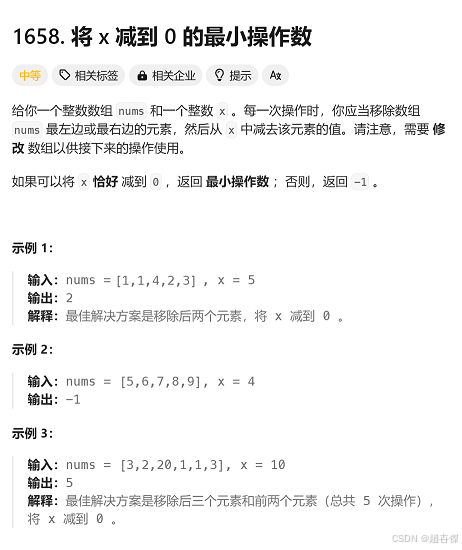 我们从正面思考问题,发现在操作数组时需要删除最左边或者最右边的元素,同时兼顾左右我们很难实现,那正面思考问题很难实现,我们就从反面思考问题 题目要求找的是和为x的最短子串,我们将问题转换为和为sum(整个数组的和)-x的最长字串,最后用数组长度减去此问题的结果就可以得到正解