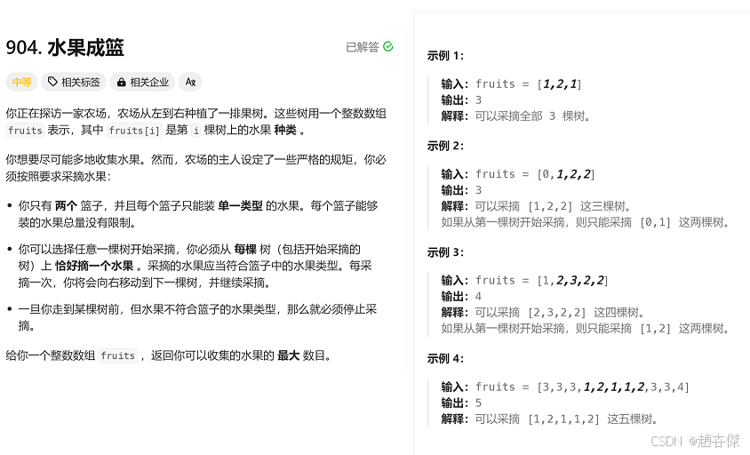 题目转换:找出一个最长的子数组的长度,子数组中不超过两种类型的水果
