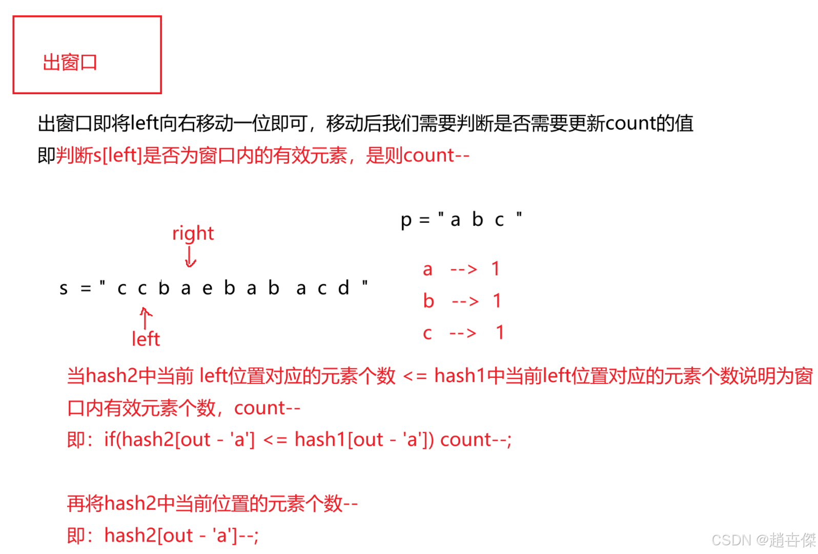 hash.put(out,hash.get(out)-1); //出窗口
