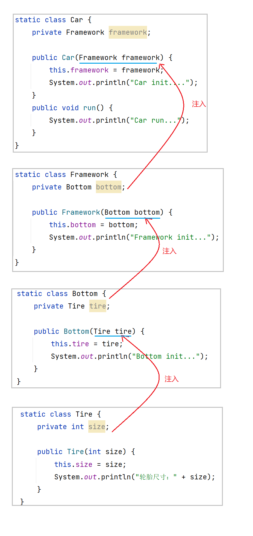 我们可以尝试不在每个类中自己创建下级类,如果自己创建下级类就会出现当下级类发生改变操作,自己也要跟着修改.此时,我们只需要将原来由自己创建的下级类,改为传递的方式(也就是注入的方式),因为我们不需要在当前类中创建下级类了,所以下级类即使发生变化(创建或减少参数),当前类本身也无需修改任何代码,这样就完成了程序的解耦