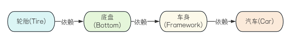 先设计轮子(Tire),然后根据轮子的大小设计底盘(Bottom),接着根据底盘设计车身(Framework),最后根据车身设计好整个汽车(Car)。这里就出现了一个"依赖”关系:汽车依赖车身,车身依赖底盘,底盘依赖轮子.