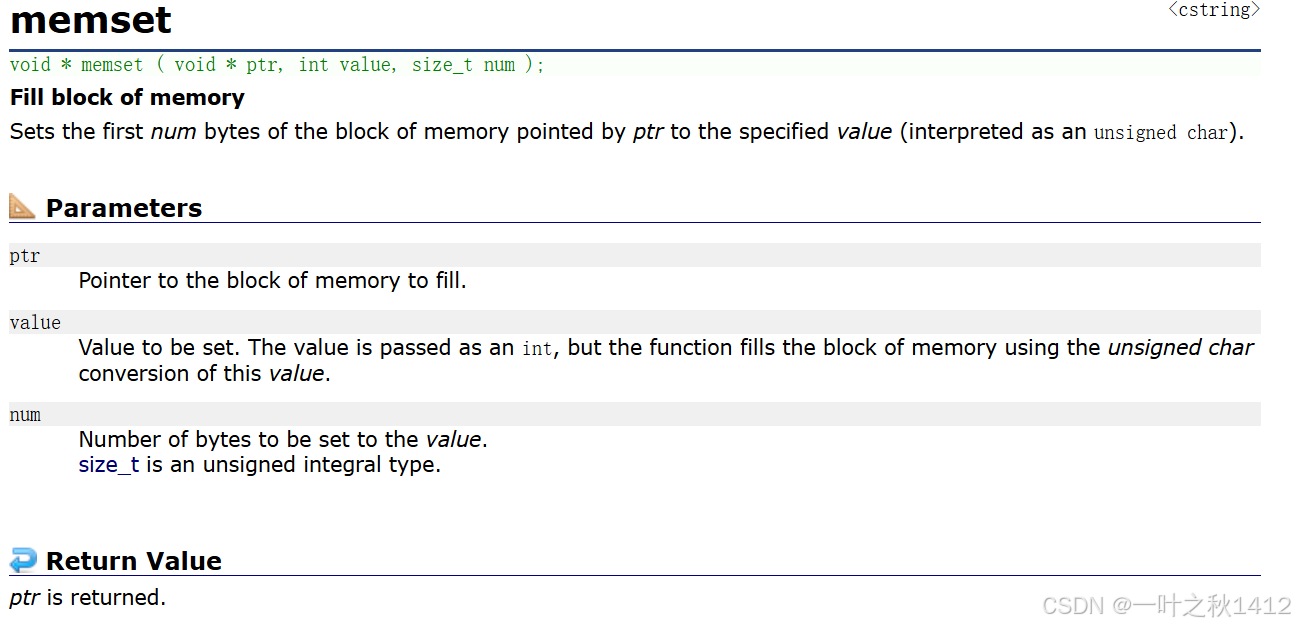 void * memset(void * ptr, int value, size_t num)memset是用来设置内存的,将内存中的值以字节为单位设置成想要的内容.