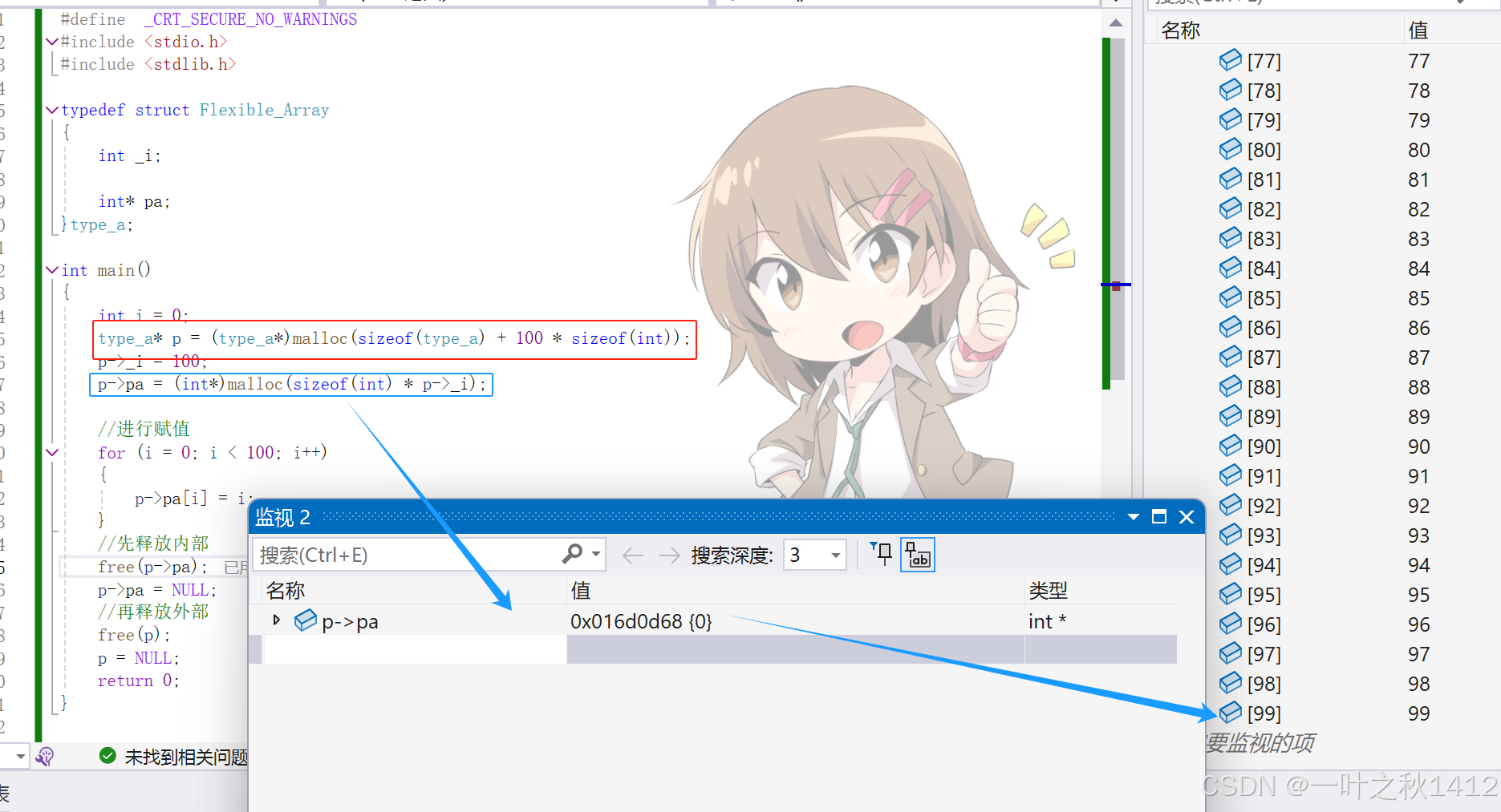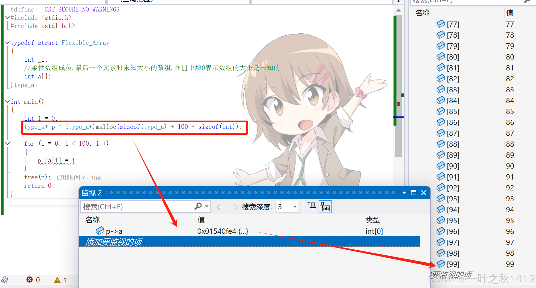 }柔性数组a[]虽然在编译的时候没有固定大小,但是在运行时通过malloc分配了额外的内存,这部分内存与结构体的其他成员是在一起连续分配的,由于malloc分配了这部分内存,并且在结构体中按需访问这些元素是安全的因此柔性数组成员a[]能够通过动态分配获得 100 个整型元素的连续空间.