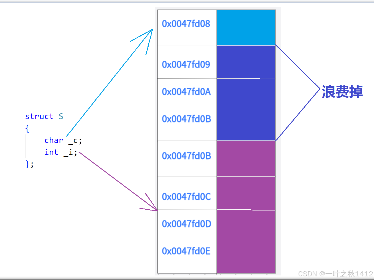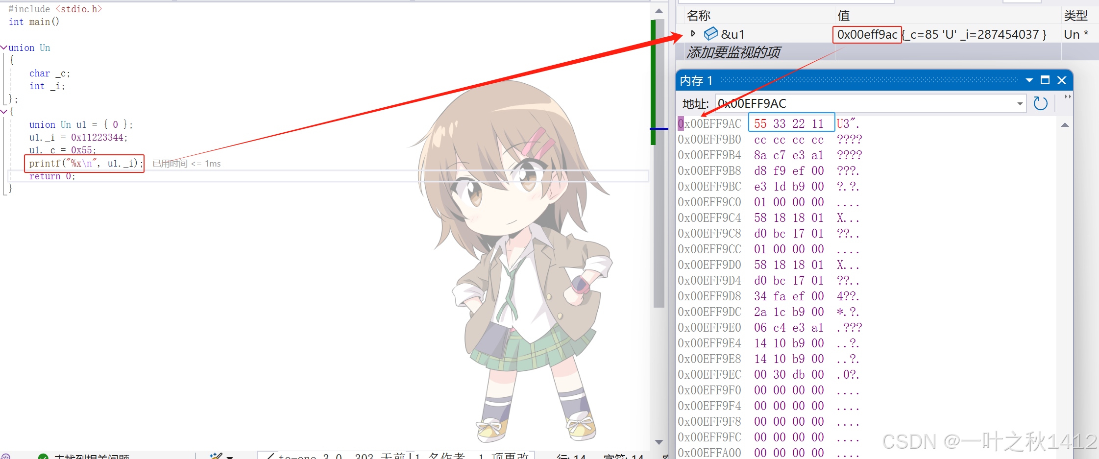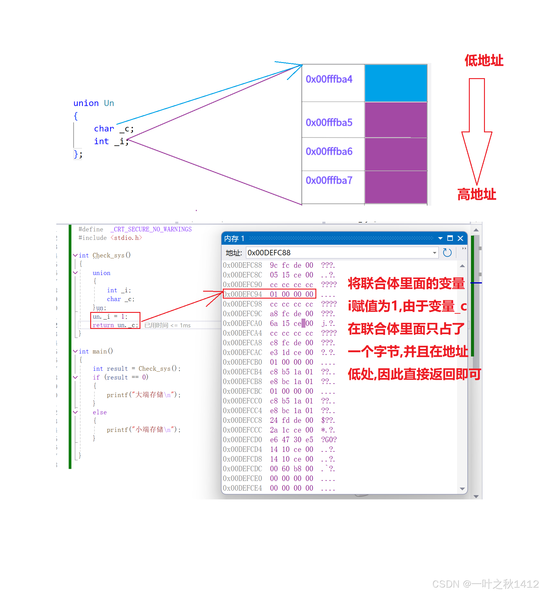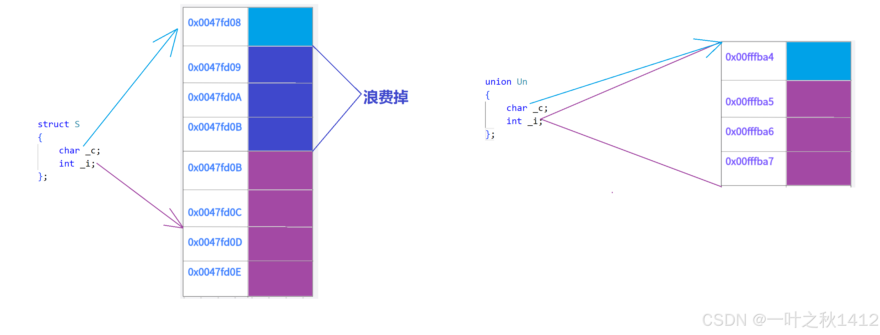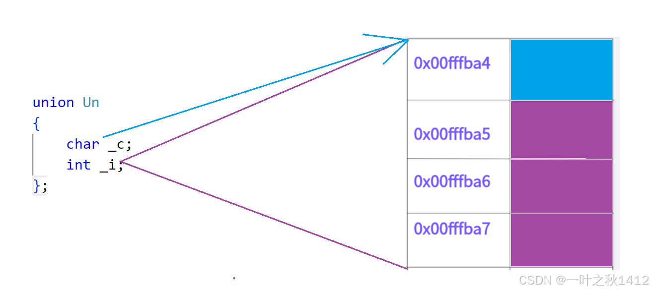 我们再来对比一下,相同成员的结构体与联合体的内存布局情况.