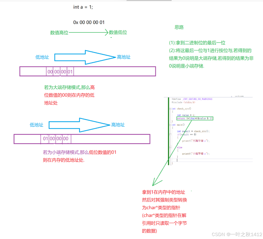 在那里我们通过拿到数值1的最低位并且按位与1来判断来判断程序的大小端