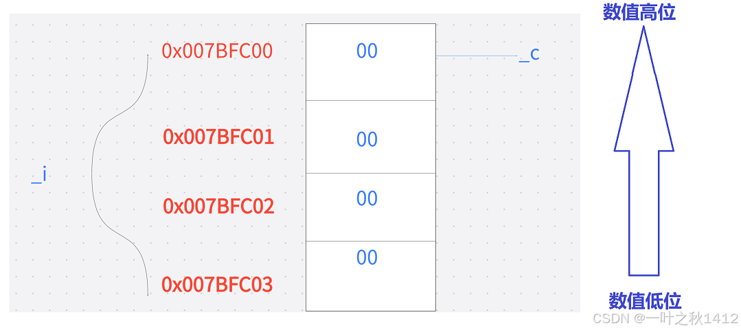 通过上面的代码我们可以分析出,将变量i的第4个字节改成了55,那么因此我们可以画出其对应的内存分布图.