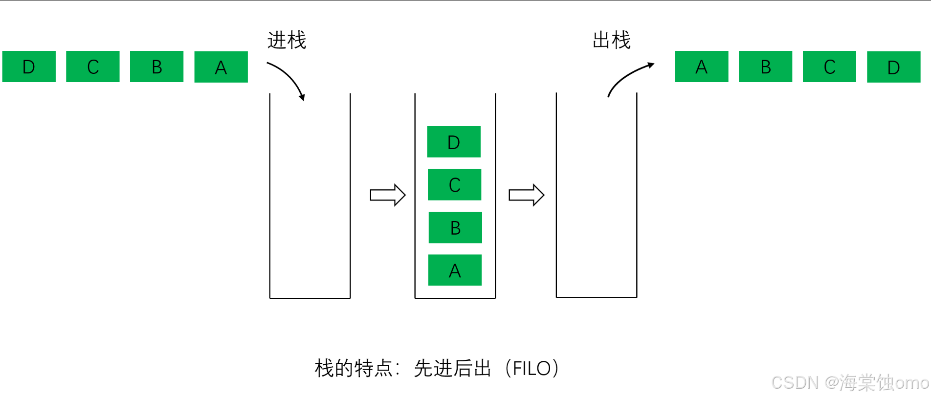 这张图简洁明了的显示了栈的特点。入的时候是以ABCD的顺序,出的时候是以DCBA的顺序。大家可以把栈想象成水桶,先倒进去的水后喝到,后倒进去的水先喝到。