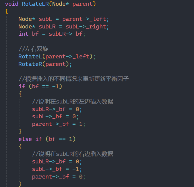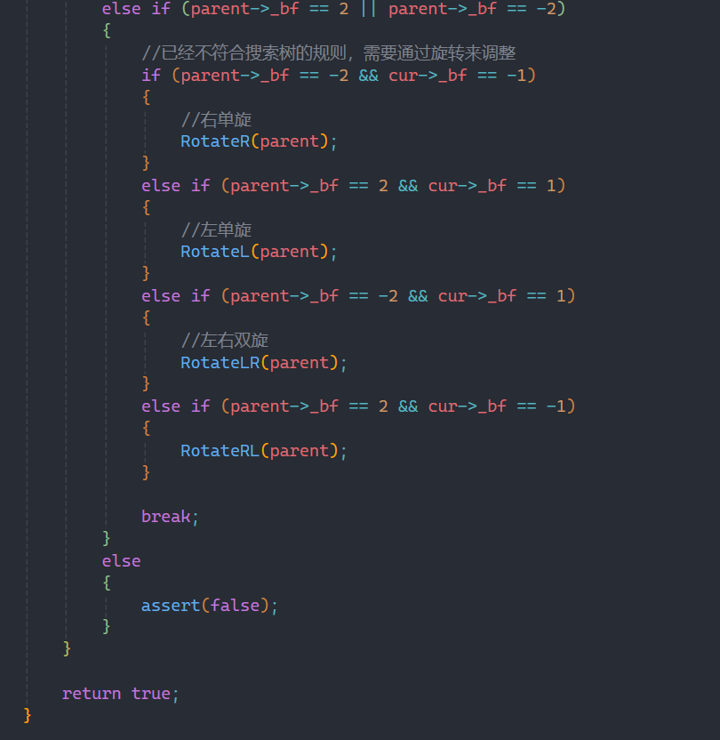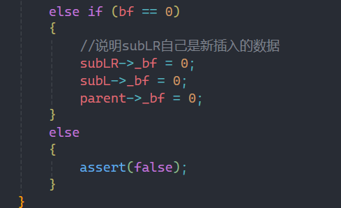 前半部分就是根据我们的思路去进行双旋,最后要根据插入新数据的位置来更新三个根结点的平衡因子。