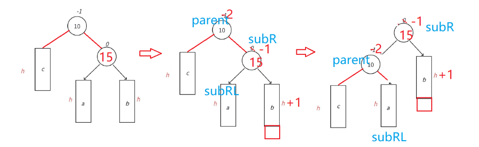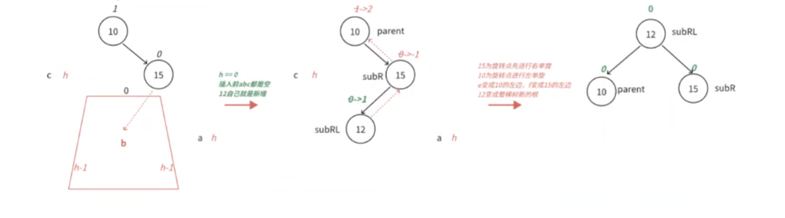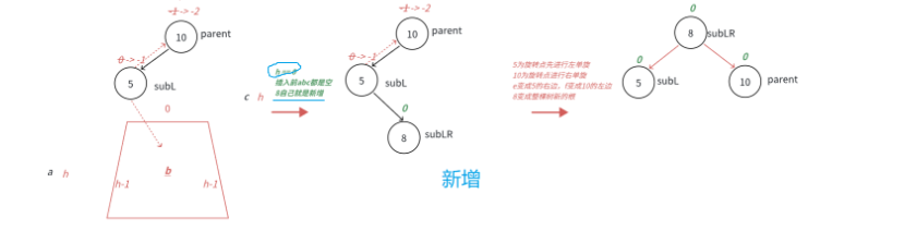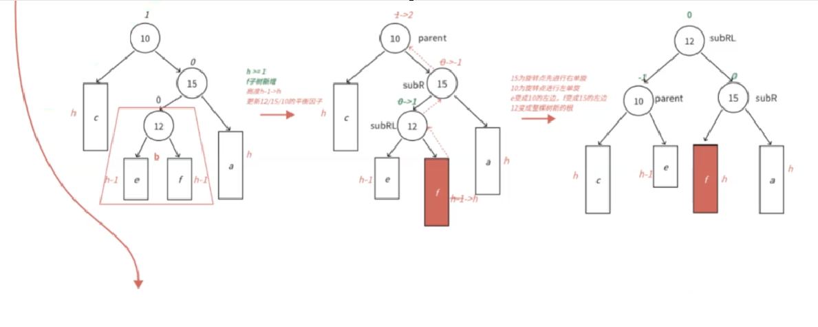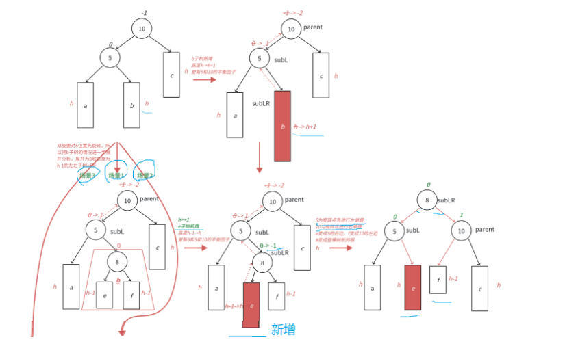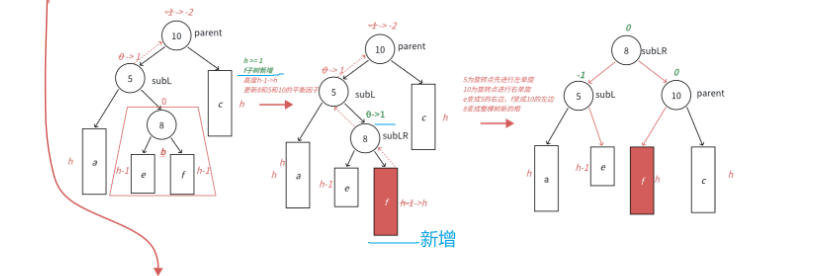 前面两种我们可以清晰看到通过左单旋和右单旋后subL和parent的平衡因子不一定为0,需要根据插入新数据的位置是在e的位置还是在f的位置而判断它们的平衡因子。