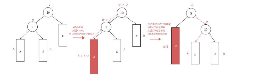 本图展示的是10为根的树,有a/b/c抽象为三棵高度为h的子树(h>=0),a/b/c均符合AVL树的要求。10可能是整棵树的根,也可能是一个整棵树中局部的子树的根。这里a/b/c是高度为h的子树,是一种概括抽象表示,他代表了所有右单旋的场景,实际右单旋形态有很多种。 在a子树中插入一个新结点,导致a子树的高度从h变成h+1,不断向上更新平衡因子,导致10的平衡因子从-1变成-2,10为根的树左右高度差超过1,违反平衡规则。10为根的树左边太高了,需要往右边旋转,控制两棵树的平衡。 旋转核心步骤,因为5<b子树的值<10,将b变成10的左子树,10变成5的右子树,5变成这棵树新的根,符合搜索树的规则,控制了平衡,同时这棵的高度恢复到了插入之前的h+2,符合旋转原则。如果插入之前10整棵树的一个局部子树,旋转后不会再影响上一层,插入结束了。