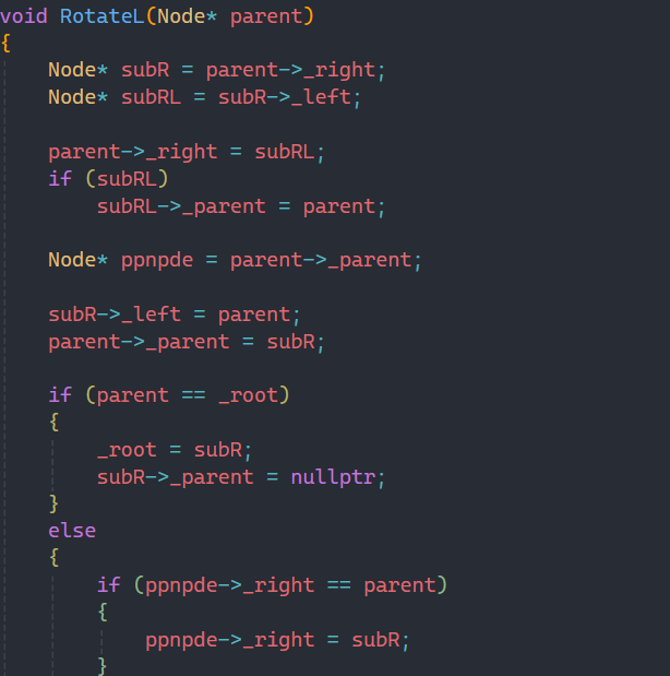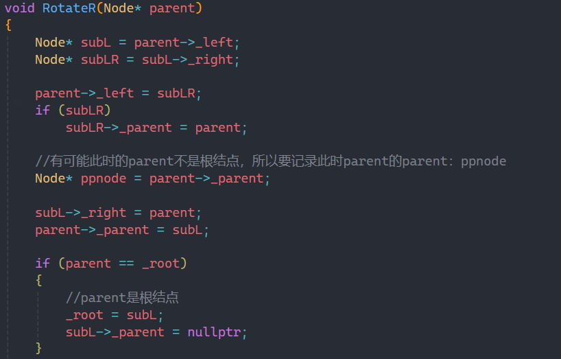 针对第一种是根结点的情况就比较简单,直接让根结点转为subL即可,并更新其_parent。
