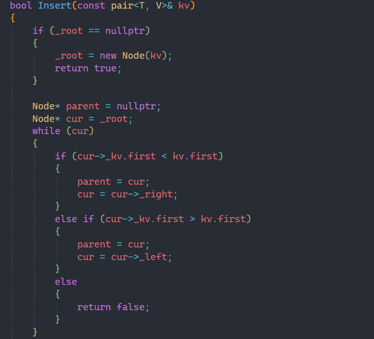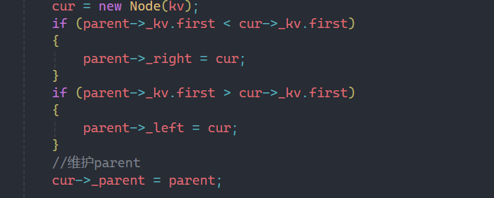 AVL树的插入依旧要遵循二叉搜索树的插入规则,所以前面这部分和二叉搜索树的插入没什么区别,唯一要注意的是我们此时是key/value的结构,所以比较的是pair中的first元素。