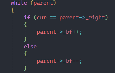 而此时我们定义的parent就发挥作用了,我们在插入后,父亲的平衡因子就会发生改变,而我们要找到父亲,就要利用parent变量。