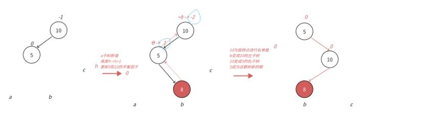 我们通过上图可以看出,虽然经过两次旋转,但是并不和单旋的情况一样,5,8,10这些根结点的平衡因子并不一定是0,所以我们要分情况来更新他们的平衡因子。