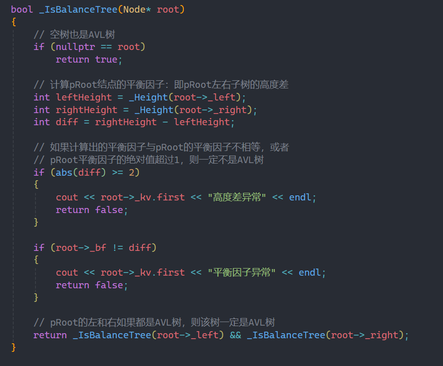 这个函数就是检测我们构建的二叉树在不断插入新的数据的过程中是否能够保持平衡,这个代码我就不过多讲解,大家看注释即可,只是给大家作为检测自己写的代码所构建的AVL树是否是合格的而已。