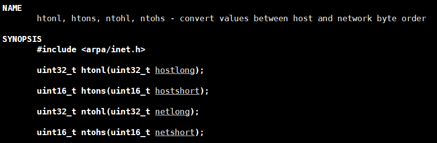 上面的两个函数是在发送数据时将数据转化成大端,后面两个函数是在接收数据时将数据转化为主机字节序,也就是如果是主机本身就是大端,那就什么也不会做,如果是小端,则会将大端数据转化为小端数据。