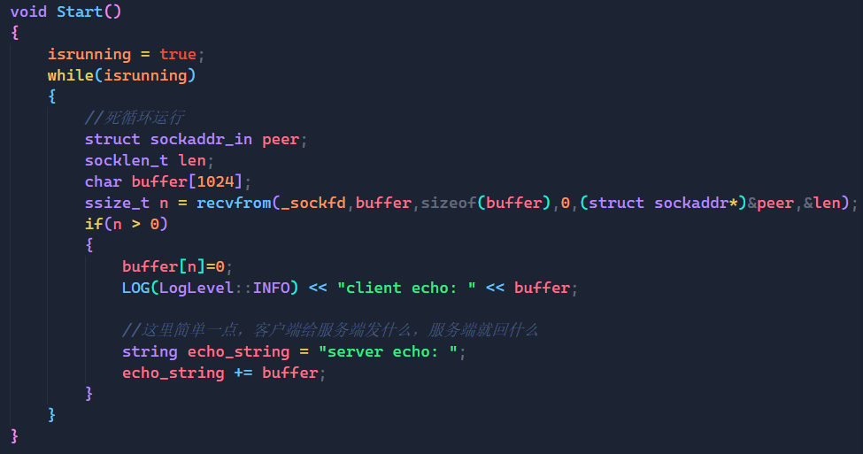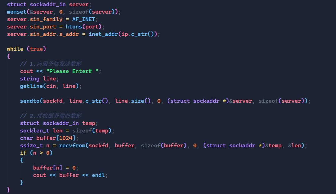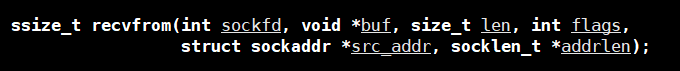 ssize_t n = recvfrom(_sockfd, buffer, sizeof(buffer), 0, (struct sockaddr *)&peer, &len);